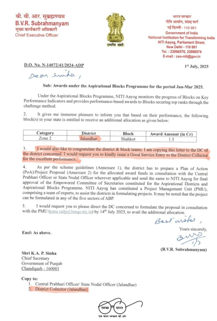* नीति आयोग द्वारा घोषित “आस्पिरेशनल ब्लॉक्स प्रोग्राम” के तहत शाहकोट (जिला जालंधर) देशभर में नंबर वन