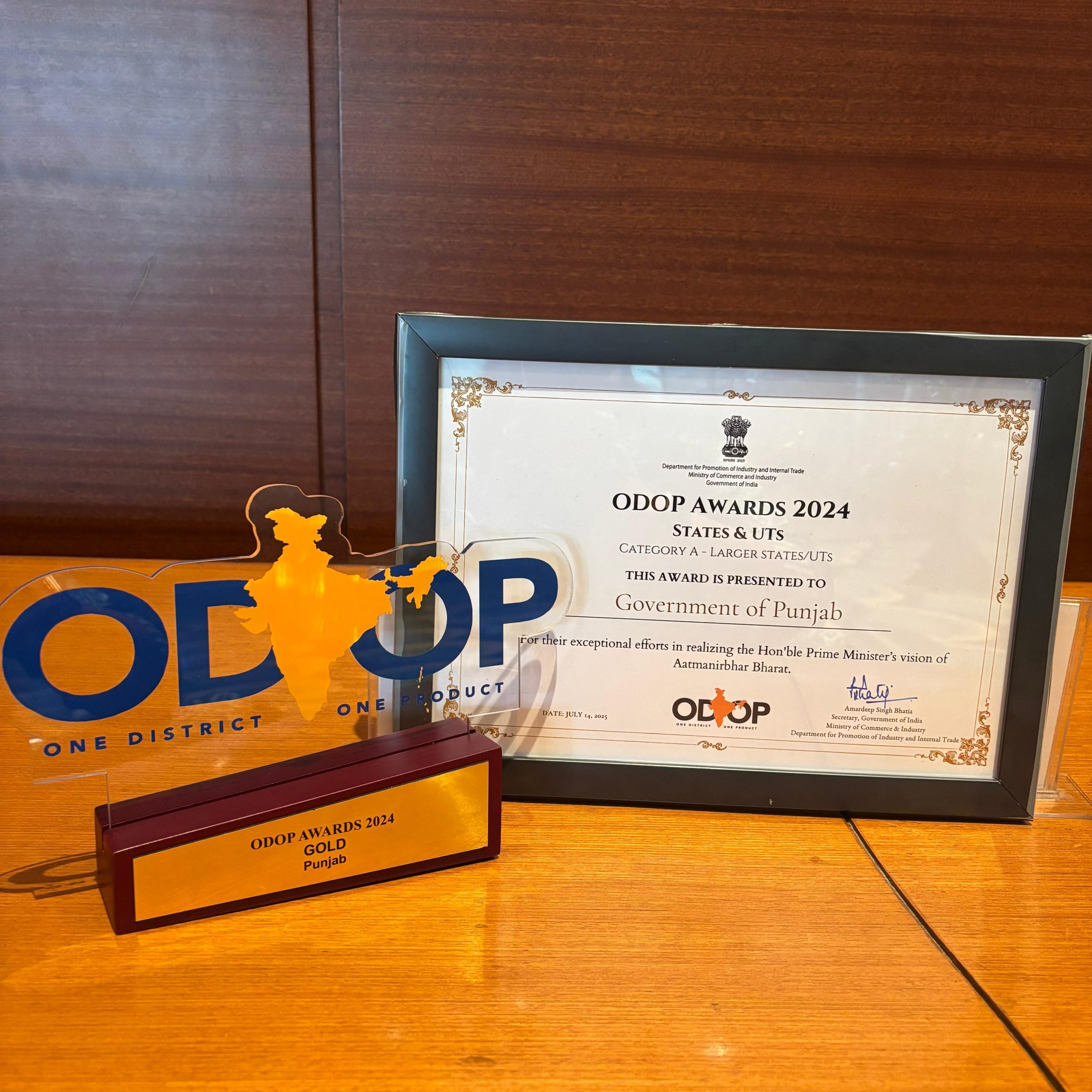 संजीव अरोड़ा ने बताया कि यह शानदार उपलब्धि उद्योग एवं वाणिज्य विभाग के अथक प्रयासों, समर्पण और टीमवर्क को दर्शाती है। “एक जिला एक उत्पाद” पहल के अंतर्गत पंजाब के सर्वोत्तम अभ्यासों को दर्शाती यह प्रस्तुति एक जिला एक उत्पाद पुरस्कार 2024 के दौरान उद्योग एवं वाणिज्य विभाग के सचिव कमल किशोर यादव द्वारा दी गई। इस प्रस्तुति के दौरान जिला-आधारित उत्पादों को प्रोत्साहित करने और कारोबार करना सुगम बनाने संबंधी पंजाब के प्रगतिशील और टिकाऊ प्रयासों को उजागर किया गया। यह पुरस्कार पंजाब के उद्योग एवं वाणिज्य विभाग की डायरेक्टर सुरभी मलिक, आई.ए.एस. द्वारा प्राप्त किया गया।