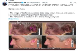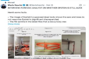 एक इंटरव्यू में फॉरेंसिक विश्लेषक डॉ. गैरीसन ने दावा किया कि अस्पताल से बाहर ले जाए गए जिस शव की तस्वीरें मीडिया में आई थीं, उसके कान और नाक एप्सटीन से मेल नहीं खाते। उन्होंने यह भी कहा कि हालिया फाइलों में FBI ने स्वीकार किया है कि प्रेस को “गुमराह” करने के लिए एक डिकॉय (नकली) शव इस्तेमाल किया गया। डॉ. गैरीसन के अनुसार, एप्सटीन की ऑटोप्सी रिपोर्ट में कई अहम विवरण गायब हैं। रिपोर्ट में उन्हें “सामान्य खतना किया हुआ पुरुष” बताया गया, जबकि पीड़िताओं ने उनके शरीर को अलग और विकृत बताया था। एक और बड़ा सवाल यह है कि एप्सटीन की मौत की घोषणा से जुड़ी एफबीआई प्रेस रिलीज़ कथित तौर पर मौत से एक दिन पहले की तारीख की बताई जा रही है।