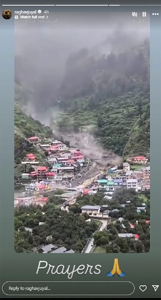 एक्टर-डांसर राघव जुयाल उत्तरखंड के रहने वाले हैं। भयानक हादसे पर उन्होंने चिंता जताई है।राघव ने इंस्टाग्राम स्टोरी पर उत्तराखंड का वीडियो शेयर किया है।उन्होंने दर्दनाक वीडियो शेयर करते हुए हाथ जोड़ने वाले इमोजी बनाई है।साथ ही लिखा है-‘प्रार्थनाएं।’