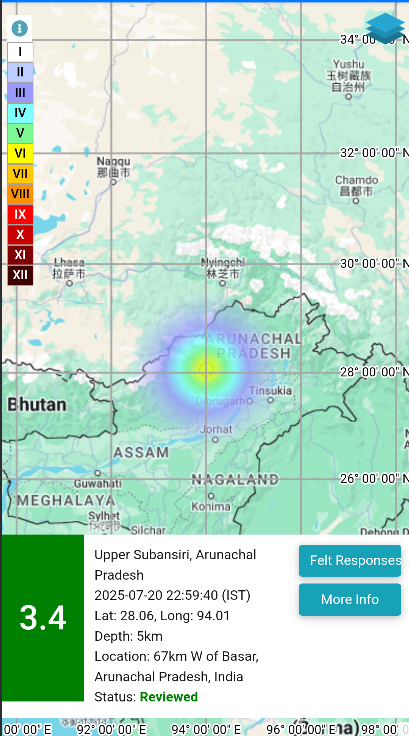 रविवार रात को ही अरुणाचल प्रदेश के ऊपरी सुबनसिरी क्षेत्र में भी भूकंप के झटके दर्ज किए गए। रात 10:59 बजे आए इस भूकंप की तीव्रता 3.4 रही और इसका केंद्र ज़मीन से सिर्फ 5 किलोमीटर नीचे था। सीमावर्ती इलाके में ये झटके हल्के लेकिन स्पष्ट रूप से महसूस किए गए।