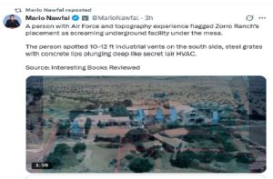 एक व्यक्ति जिसे वायुसेना और टोपोग्राफी का अनुभव बताया जाता है, ने रैंच की मेसे (mesa) के नीचे संभावित भूमिगत सुविधा होने के संकेतों की ओर ध्यान दिलाया। दक्षिणी हिस्से में 10–12 फीट के औद्योगिक वेंट, स्टील ग्रेट्स और गहराई में जाती कंक्रीट-लिप वाली संरचनाओं का उल्लेख किया गया है, जो किसी गुप्त एचवीएसी/अंडरग्राउंड नेटवर्क की आशंका पैदा करते हैं।