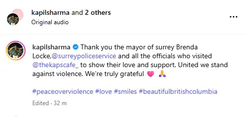 कपिल शर्मा ने कुछ वीडियो व तस्वीरें भी शेयर की है, जिसमें स्थानीय पुलिस अधिकारी उनके कैफे में बैठकर खाने के स्वादले रहे हैं। बता दें कि, हमले के बाद से ही कपिल शर्मा चुप बैठे थे। अब जाकर उन्होंने अपनी चुप्पी तोड़ते हुए कुछ वीडियो और तस्वीरें अपने इंस्टाग्राम पेज पर शेयर की हैं।