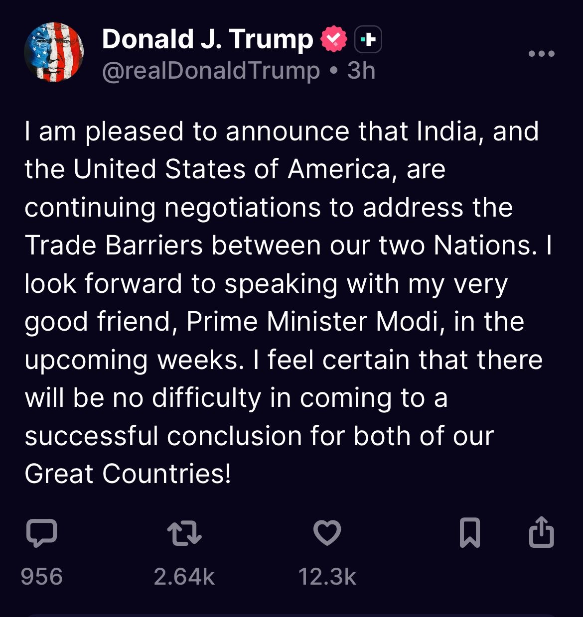 अपने पोस्ट में ट्रंप ने प्रधानमंत्री नरेंद्र मोदी को “बहुत अच्छा दोस्त” बताते हुए कहा कि वे आगामी हफ्तों में उनसे सीधी बातचीत करने को उत्सुक हैं। ट्रंप ने लिखा: “मुझे खुशी है कि भारत और अमेरिका के बीच व्यापार से जुड़ी अड़चनों को हटाने पर लगातार चर्चा हो रही है। मुझे पूरा भरोसा है कि दोनों देशों के लिए लाभदायक समझौता जल्द सामने आएगा।”