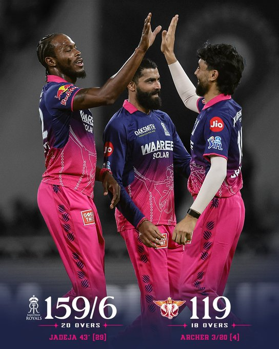 आईपीएल क्रिकेट में राजस्थान रॉयल्स ने कल रात लखनऊ सुपर जाएंट्स को 40 रन से हरा दिया। 160 रन के लक्ष्य के जवाब में लखनऊ सुपर जाएंट्स लखनऊ में 18 ओवर में सिर्फ 119 रन ही बना सका। लखनऊ सुपर जाएंट्स ने टॉस जीतकर पहले गेंदबाजी करने का फैसला किया।