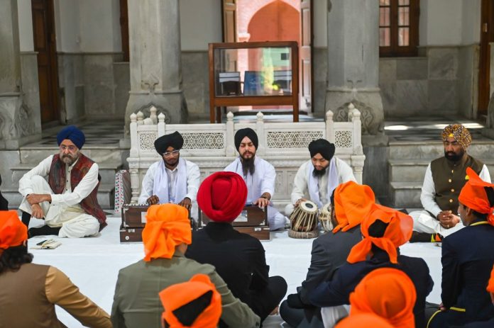 (1) लाहौर स्थित एचिसन कॉलेज गुरुद्वारा साहिब में शुक्रवार, 13 फरवरी 2026 को शबद कीर्तन प्रस्तुत करता रागी जत्था।