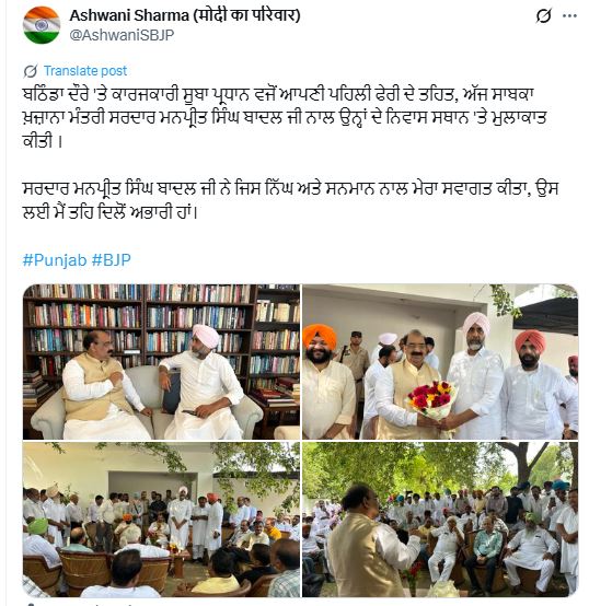 पंजाब डेस्क : पंजाब भाजपा के कार्यकारी प्रधान और पठानकोट से विधायक अश्विनी कुमार शर्मा का 2027 के चुनावों को लेकर बड़ा बयान सामने आया है। मिली जानकारी के अनुसार अश्विनी शर्मा आज पूर्व वित्त मंत्री मनप्रीत सिंह बादल से मिलने पहुंचे। दोनों नेताओं की ये मीटिंग गांव बादल में हुई। इस दौरान दोनों में अगामी चुनावों को लेकर गठजोड़ की चर्चा भी छिड़ी। सोशल मीडिया पर पोस्ट साझा करते हुए, शर्मा ने मनप्रीत सिंह बादल द्वारा किए गए गर्मजोशी भरे और सम्मानजनक स्वागत के लिए आभार व्यक्त किया।