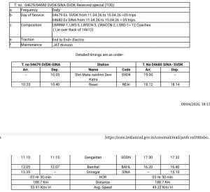 जम्मू ( तनवीर ) : जम्मू-कश्मीर में रेल यात्रियों के लिए अच्छी खबर है। Indian Railways ने कटरा से श्रीनगर के बीच स्पेशल ट्रेन सेवा शुरू करने का ऐलान किया है। यह स्पेशल ट्रेन (04679/04680) श्री माता वैष्णो देवी कटरा रेलवे स्टेशन से श्रीनगर के बीच चलेगी। यह सेवा 11 अप्रैल 2026 से 15 अप्रैल 2026 तक रोजाना संचालित की जाएगी, जिसमें कुल 5-5 फेरे होंगे। जम्मू-कश्मीर में अतिरिक्त भीड़ को देखते हुए, रेलवे ने 11/4 से 15/4 तक एक और स्पेशल ट्रेन चलाने की योजना बनाई है। कृपया विवरण देखें।