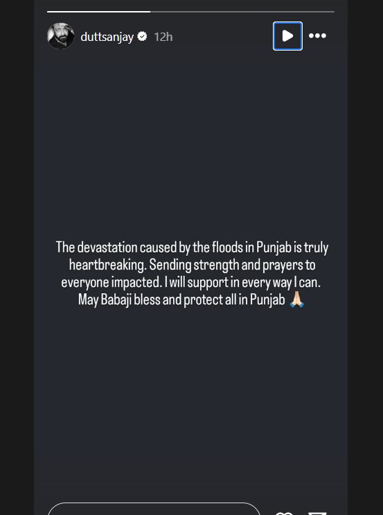 संजय दत्त ने अपनी पोस्ट में लिखा, “जो कुछ पंजाब में हो रहा है, वह सच में दिल तोड़ देने वाला है। मैं इस संकट की घड़ी में पंजाब के लोगों के साथ खड़ा हूं। सभी प्रभावित लोगों को शक्ति और प्रार्थनाएं भेज रहा हूं। मैं हर संभव मदद करूंगा। बाबाजी सभी को आशीर्वाद दें और उनकी रक्षा करें।”