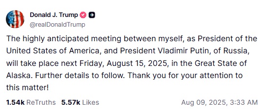 ट्रंप ने कहा, “दोनों देशों के हित में कुछ क्षेत्रों की अदला-बदली होगी।” ट्रंप की यह घोषणा व्हाइट हाउस में आर्मेनिया और अज़रबैजान के बीच शांति समझौते के अनावरण के कुछ ही घंटों बाद आई, जिसे उन्होंने कई वैश्विक संघर्षों को सुलझाने के लिए एक आक्रामक प्रयास बताया है। राष्ट्रपति पद पर वापसी के बाद यह मुलाकात ट्रंप की पुतिन से पहली आमने-सामने की मुलाक़ात होगी। अलास्का का चुनाव – जो रणनीतिक रूप से अमेरिका और रूस के बीच स्थित है – इस वार्ता के प्रतीकात्मक महत्व को रेखांकित करता है। पुतिन की अलास्का यात्रा एक दशक में उनकी पहली संयुक्त राज्य अमेरिका यात्रा होगी। उन्होंने पिछली बार सितंबर 2015 में न्यूयॉर्क में संयुक्त राष्ट्र महासभा के दौरान राष्ट्रपति बराक ओबामा से मुलाकात करते हुए अमेरिका का दौरा किया था।