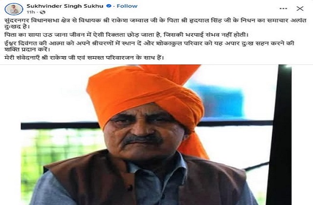 जानकारी के अनुसार, मियां हरदयाल सिंह का अंतिम संस्कार उनके पैतृक गांव पुंघ में पूरे सम्मान के साथ किया जाएगा। इस दुखद घड़ी में, पूरा भाजपा परिवार और प्रदेश के अन्य गणमान्य व्यक्ति राकेश जम्वाल और उनके परिवार के साथ खड़े हैं।