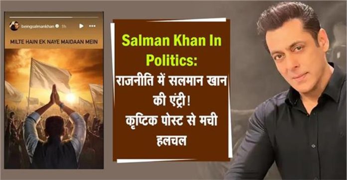 सलमान ने अपने इंस्टाग्राम अकाउंट की स्टोरी पर एक पोस्ट शेयर किया। इस पोस्ट में एक तस्वीर हैं जो एनिमेटिड है इस तस्वीर में सलमान का चेहरा नजर नहीं आ रहा लेकिन उनका ब्लू ब्रेसलेट दिखाई दे रहा है। सलमान दोनों हाथ जोड़कर खड़े दिखाई दे रहे हैं।इस तस्वीर पर लिखा है- मिलते हैं नए मैदान में। ऐसे में फैंस इस बात का आंकलन लगा रहे हैं कि शायद सलमान पॉलिटिक्स में एंट्री करने जा रहे हैं।