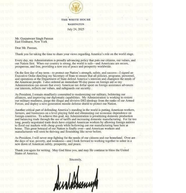 Washington:(सरबजीत सिंह बनूड़): अमेरिका के राष्ट्रपति डोनाल्ड जे. ट्रंप द्वारा भारत में प्रतिबंधित संगठन सिख्स फॉर जस्टिस (SFJ) के अटॉर्नी जनरल गुरपतवंत सिंह पन्नू को लिखी चिट्ठी ने अंतर्राष्ट्रीय राजनीति में हलचल मचा दी है। अमेरिका-भारत व्यापार समझौते से कुछ दिन पहले, कथित तौर पर ट्रंप द्वारा पन्नू को लिखा गया एक पत्र सोशल मीडिया पर वायरल हो रहा है। यह चिट्ठी व्हाइट हाउस के आधिकारिक लेटरहेड पर 24 जुलाई 2025 को जारी हुई । हालांकि अभी इस पत्र की स्वतंत्र पुष्टि नहीं हुई है। हालांकि कुछ विशेषज्ञों के अनुसार इसे अमेरिका की भारत के खिलाफ नई साजिश के तौर पर देखा जा रहा है जिससे ट्रंप का भारत विरोधी चेहरा पूरी तरह बेनकाब हो गया है। और दूसरी तरफ यह पत्र अमेरिका-भारत संबंधों को नुकसान पहुँचाने के लिए एक रणनीतिक रूप से रची गई दुष्प्रचार चाल बताया जा रहा है।