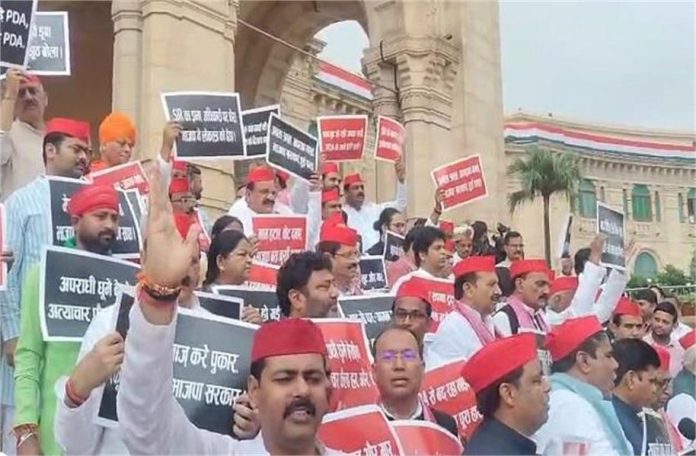 यूपी न्यूज: उत्तर प्रदेश में विधानसभा का मानसून सत्र आज यानी सोमवार से शुरू होने जा रहा है। विपक्ष ने सरकार को घेरने की तैयारी कर ली है। विपक्ष सदन में स्कूलों के विलय पीडीए पाठशाला, बाढ़, महिला सुरक्षा समेत कई मुद्दे उठाएगी। सदन की कार्यवाही शुरू होने से पहले समाजवादी पार्टी ने सदन के बाहर जमकर हंगामा किया है। सपा ने हाथों में तख्तियां लेकर सरकार के खिलाफ जमकर नारेबाजी की है।