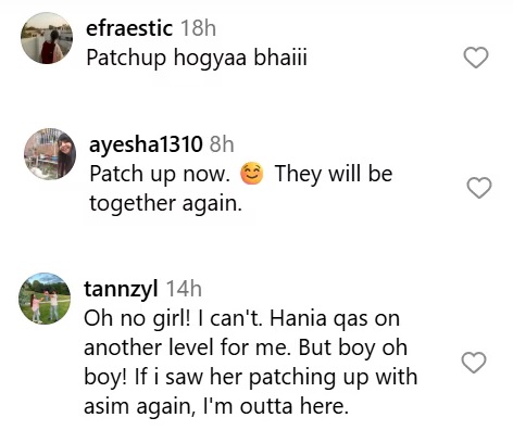 एक यूजर ने लिखा- ‘पैचअप हो गया भाई।’ दूसरे यूजर ने कमेंट किया- ‘अरे नहीं यार।ये मैं नहीं देख सकती।हानिया मेरे लिए एक अलग ही लेवल पर है। अब मैं उसे फिर से आसिम के साथ पैचअप करते देख रही हूं।’ एक शख्स ने सलाह देते हुए कहा- ‘अब पैचअप कर लो वो फिर साथ होंगे।’ एक शख्स ने लिखा- ‘हानिया चली अपने एक्स के पास।’